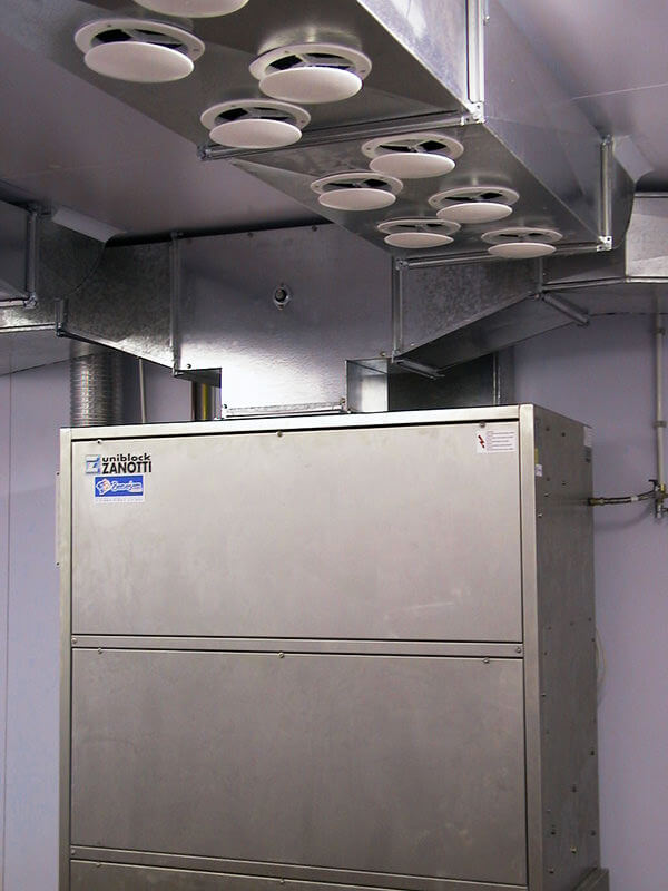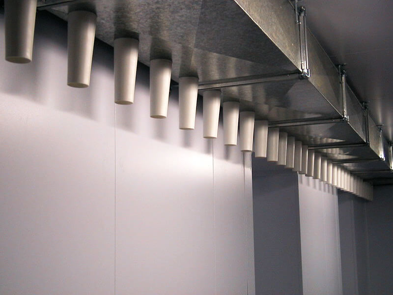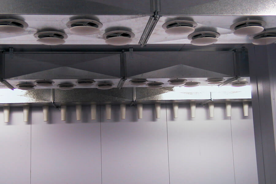 Detalle de la instalación de los conductos metálicos con sus respectivas bocas de impulsión y retorno de aire de una instalación frigorífica para un secadero de quesos, en la finca Cavalleria Nova en Ciutadella de Menorca ( www.cavallerianova.com ).